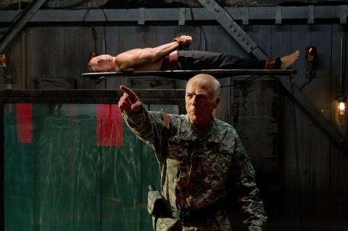 Justin Hartley and Michael Hogan films a scene in episode Patriot.